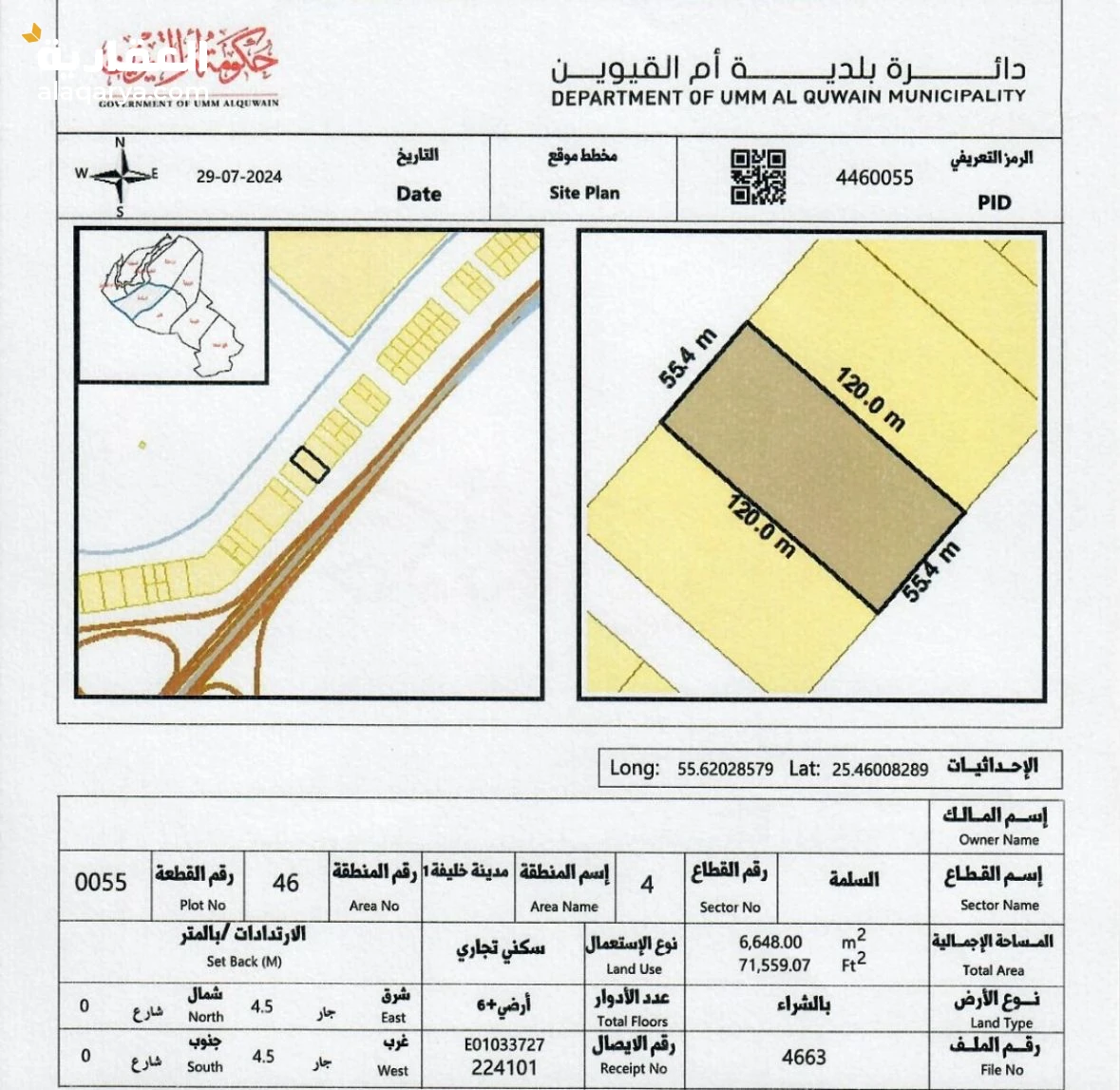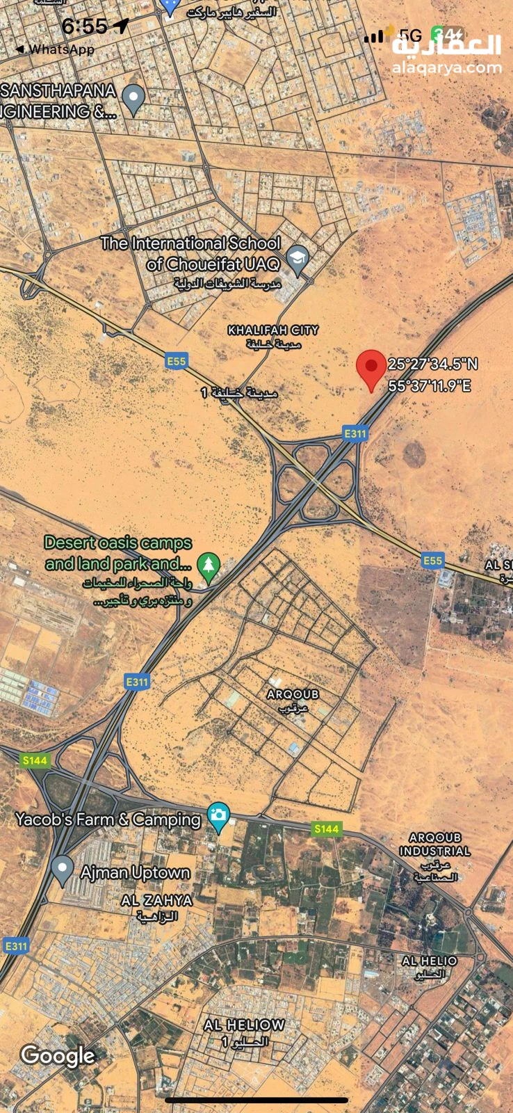 For sale, residential and commercial lands in Umm Al Quwain on Sheikh Mohammed bin Zayed Road, close to Ajman, freehold for all nationalities. Area of each plot: 71,559 square feet. Use: ground floor and six. Price per foot: 110.