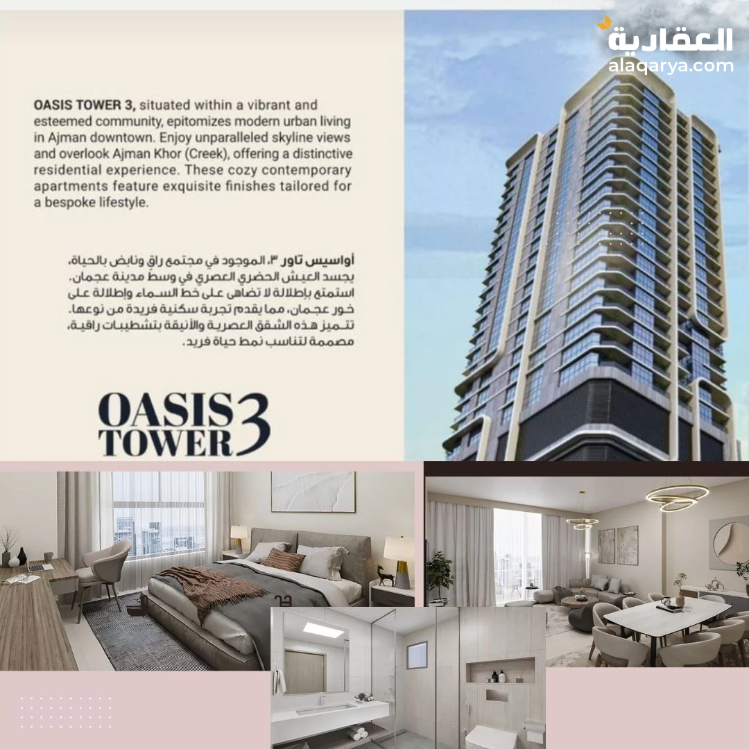 مشروع أبراج خور عجمان من شركة جيه جيه بروبرتيز يوفر شققًا فاخرة على الواجهة المائية في منطقة خور عجمان مع موقع مميز: - 25 دقيقة إلى مطار دبي الدولي - 14 دقيقة إلى سيتي سنتر عجمان - 8 دقائق إلى شاطئ عجمان - 5 دقائق إلى مستشفى أمينة يتكون المشروع من 5 أبراج تضم ما مجموعه 1875 شقة: المميزات الرئيسية: - تشطيبات فاخرة - غرف واسعة مع إطلالات على الخور - مطابخ مجهزة بالكامل المرافق: - مسابح للعائلات والأطفال - مسارات للمشي ومناطق لعب للأطفال - حدائق طبيعية ومنسقة - نادي صحي مجهزبتقنيات Technogym - مطاعم ومتاجر أسعار: 1 غرفة نوم من درهم 591,000 /- 2 غرفة نوم من درهم 918,000 / - القسط الشهري: 1 غرفة نوم من AED 6,685/شهريا 2 غرفة نوم من AED 10,380/شهريا خطة الدفع: 5 ٪ دفعة أولى خطة سداد لمدة 7 سنوات التسليم - Q4 ، 2026